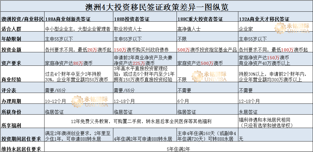 一圖秒懂澳洲4大主流投資移民方式差異,哪個更適合你?