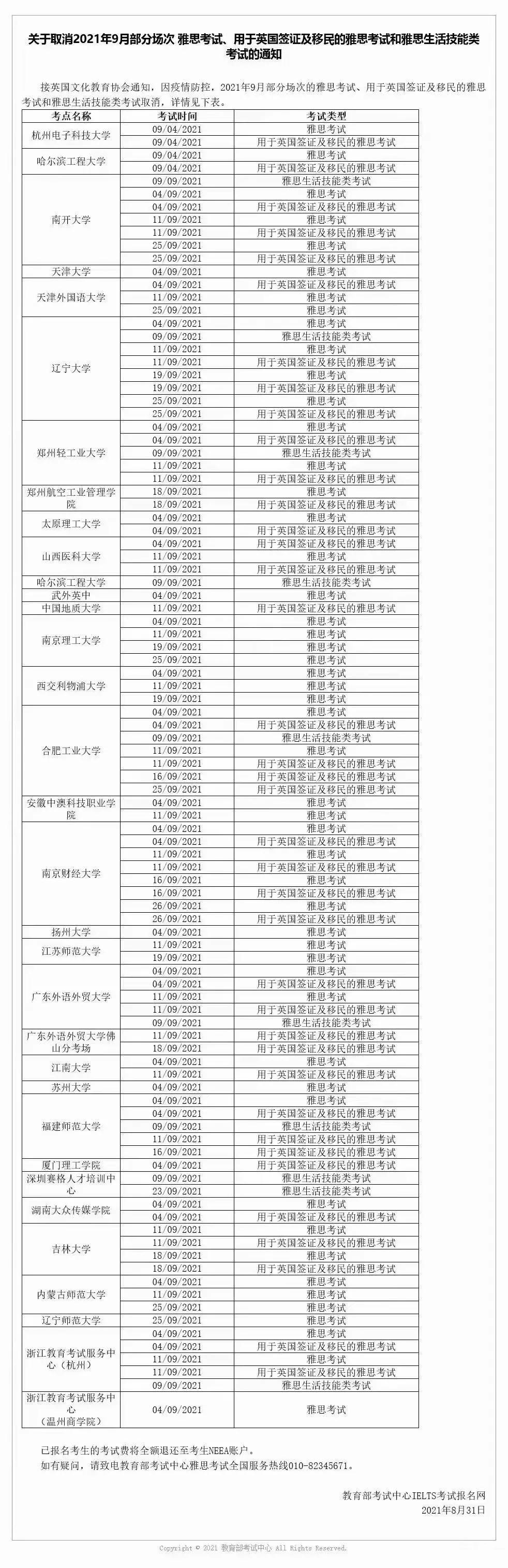 8月31日,教育部考試中心IELTS考試報名網發布一則通知:接英國文化教育協會通知,因疫情防控,2021年9月部分場次的雅思考試、用于英國簽證及移民的雅思考試和雅思生活技能類考試取消。已報名考生的考試費將全額退還至考生NEEA賬戶。詳情見下表。