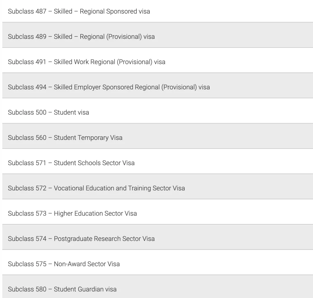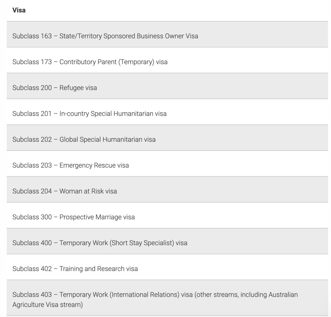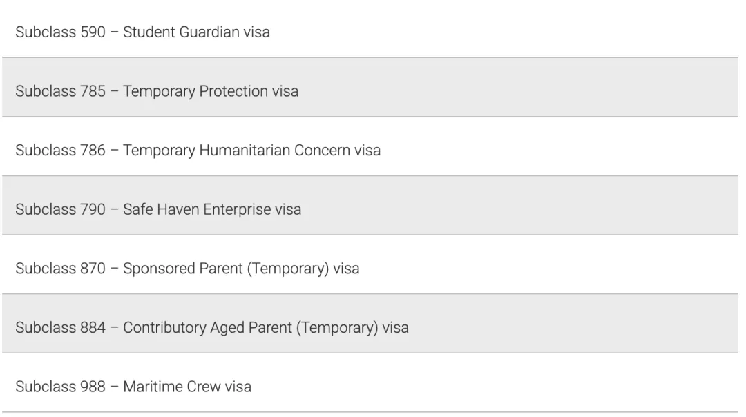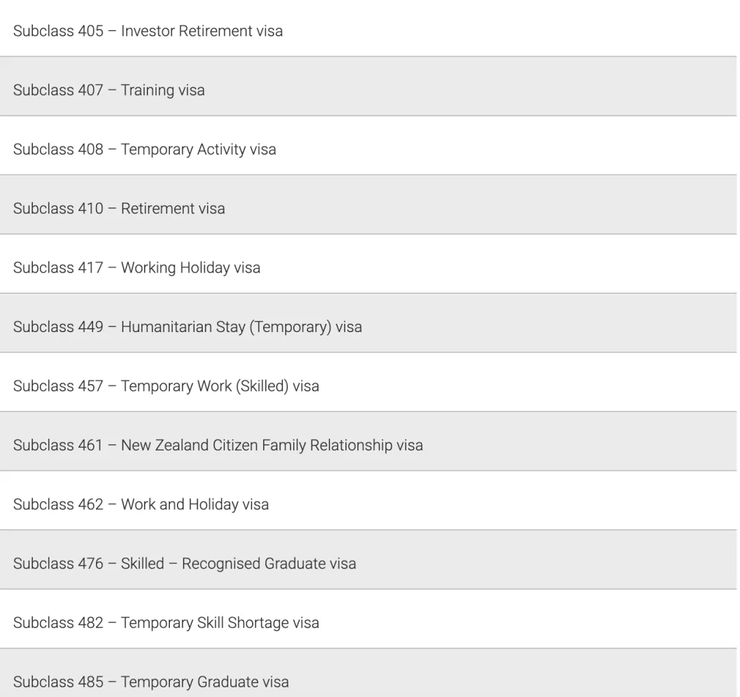 要被視為合格的簽證持有人,必須持有以下簽證之一。如果已申請簽證但尚未獲得批準,則不是符合條件的簽證持有人。符合條件的簽證類別包括: