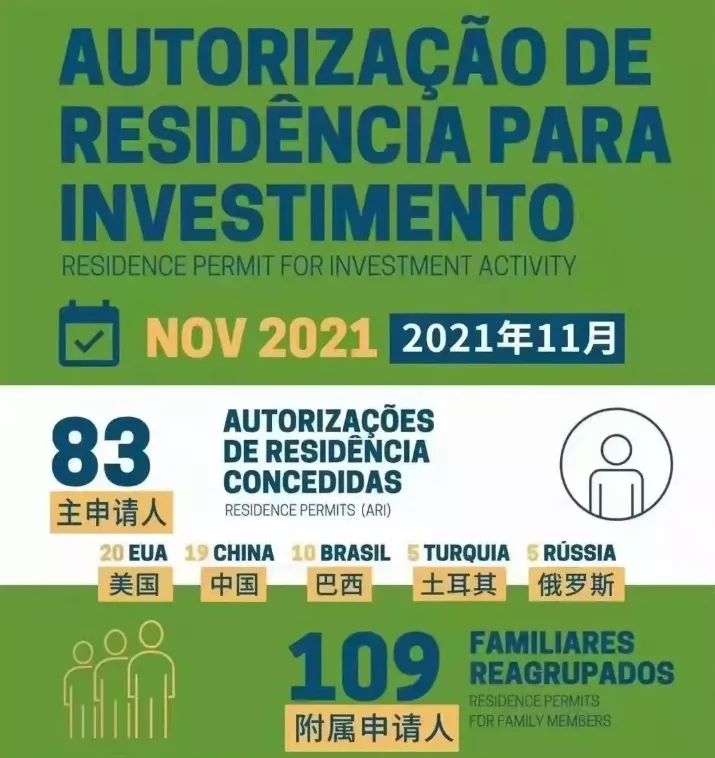 12月6日,葡萄牙移民局(SEF)發布了2021年11月黃金簽證最新數據!11月全球共計83位投資人攜109位家屬獲批,美國主申請人數第一次超越中國排名首位,申請人數為20人。中國主申請人數為19人,居第二位;巴西位居第三。