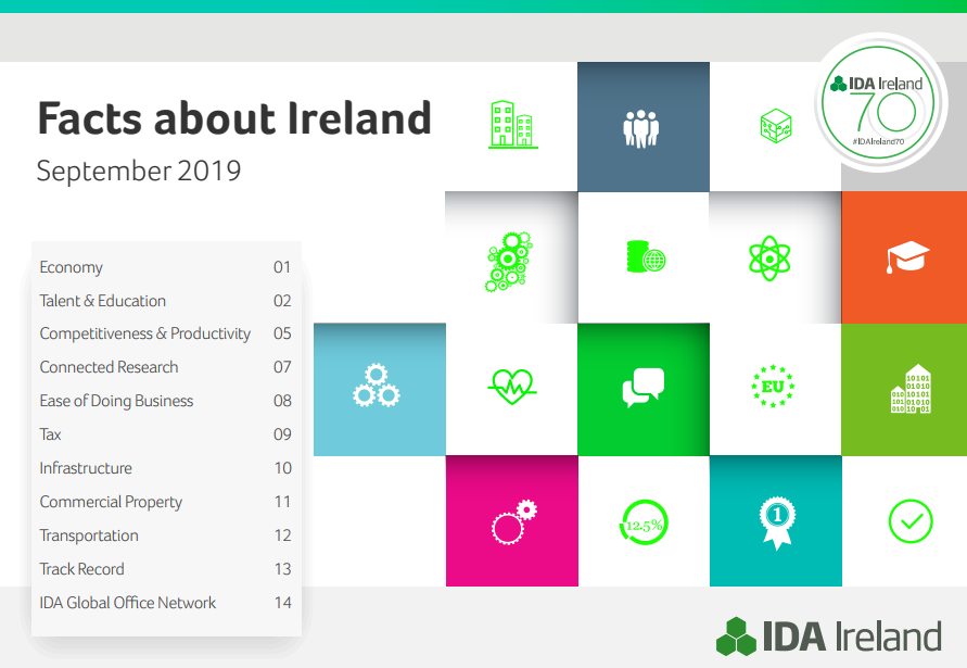 近日,愛爾蘭投資發(fā)展局(IDA)公布了2019年最新的Facts about Ireland。報告用清晰的數(shù)據(jù),呈現(xiàn)了愛爾蘭在經(jīng)濟、教育、全球競爭力、稅收等方面的全球排名和地位。