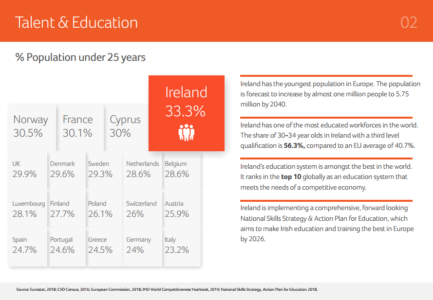 愛爾蘭的確擁有歐洲最年輕的人口,25歲以下群體占愛爾蘭人的1/3。愛爾蘭沿用英式教育,教育系統(tǒng)排名全球前十,近30%學(xué)生在科學(xué)、技術(shù)、工程和數(shù)學(xué)(STEM)領(lǐng)域深造。愛爾蘭30-34歲的年輕人中有56.3%接受了高等教育,位居歐洲第一。同時,愛爾蘭在吸引和留住國際人才方面排名全球第一。