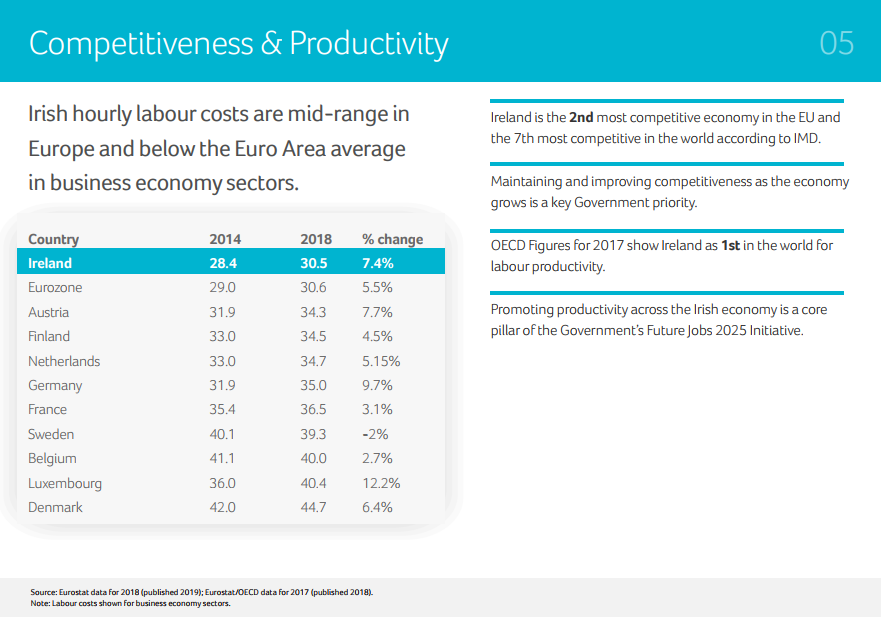 據(jù)IMD報告,愛爾蘭是歐盟第二大及全球第七大最具競爭力經(jīng)濟體。另據(jù)經(jīng)合組織(OECD)報告,愛爾蘭勞動力被列為世界上生產(chǎn)效率最高的勞動力。2011-2017年度IBM全球區(qū)域趨勢報告,愛爾蘭更是連續(xù)6年蟬聯(lián)“吸引全世界高價值項目投資”全球第一。