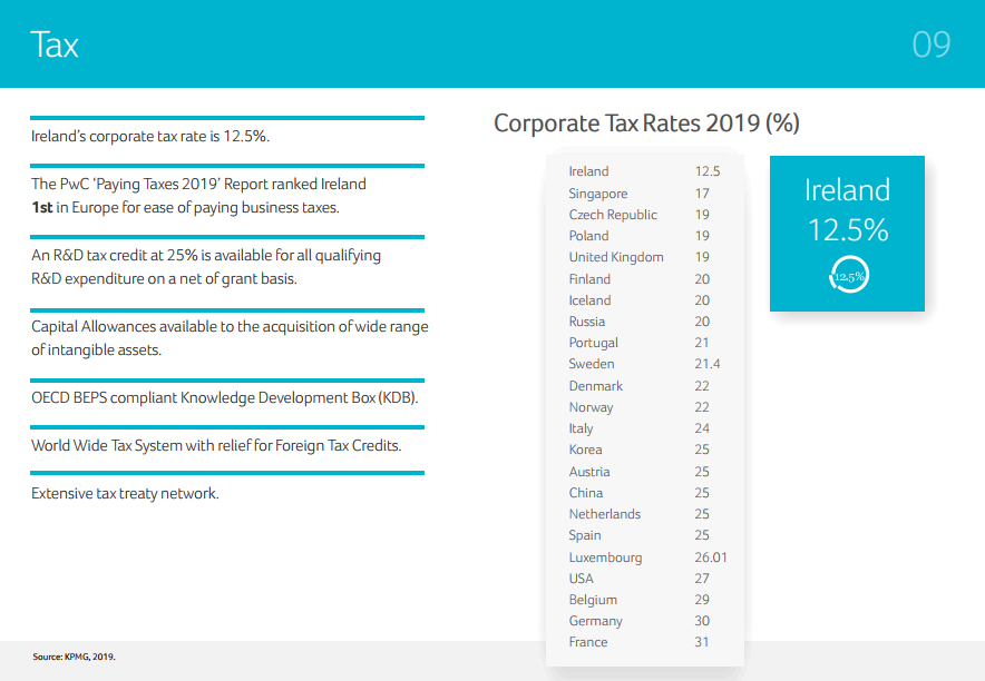 愛爾蘭企業(yè)稅率僅12.5%,據(jù)PwC發(fā)布的“Paying Taxes 2019”報告,愛爾蘭在企業(yè)稅收優(yōu)惠方面,排在歐洲首位。得益于愛爾蘭優(yōu)惠的稅收政策及利商的經(jīng)濟環(huán)境,在愛爾蘭投資的跨國公司中,有1/3企業(yè)已在愛爾蘭開展業(yè)務(wù)20余年。