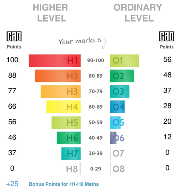 愛爾蘭高考滿分為625分(六門課單科成績為滿分100分,其中數學只要及格就獲得25分附加分)。學生的百分制分數會轉換成相應的1-8等級計分方式,包括“高級水平(H)”和“普通水平(O)”(考生可以根據自身情況選擇考試等級),每個等級會獲得不同的CAO點數,這些點數疊加用來申請理想的學校和專業。
