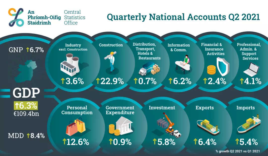 日前,愛爾蘭中央統計局(CSO)發布最新數據:與第一季度相比,愛爾蘭2021年第二季度的經濟增長了6.3%,該數據是歐洲所有國家中增長最高的。