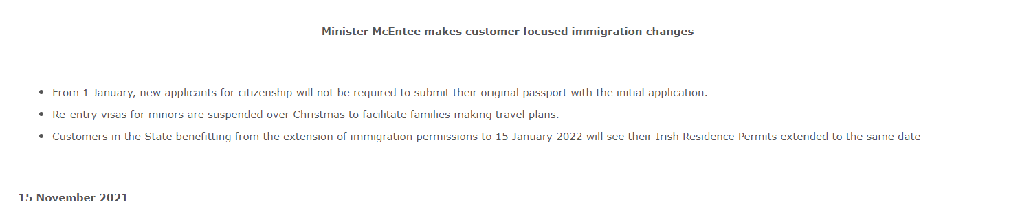 11月15日,愛爾蘭司法部長海倫·麥肯蒂(Helen McEntee)宣布了一系列利好的移民舉措:包括簡化入籍申請程序;以及臨時放寬持過期但符合延期要求的IRP卡人士的出入境限制,以方便他們能在圣誕假期及2022年1月15日之前往返愛爾蘭;同時臨時取消了16歲以下兒童需提供再入境簽證的要求。