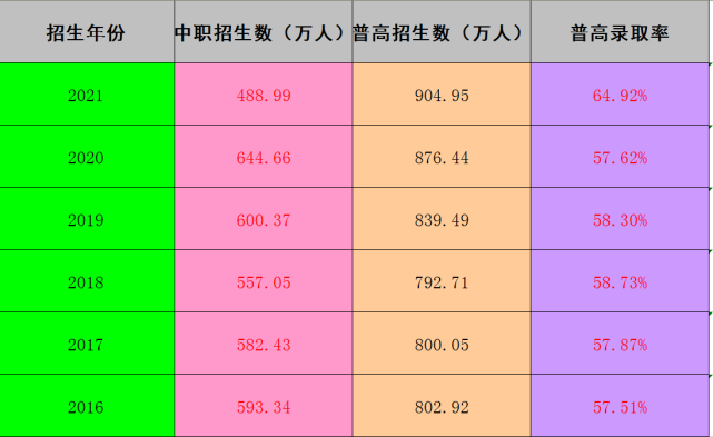 從上圖看,2016年至2021年,全國(guó)普通高中招生人數(shù)從802萬(wàn)提高到904萬(wàn),增幅達(dá)12.5%。雖然普通高中的錄取率逐年提升,但是每年仍有數(shù)百萬(wàn)學(xué)生被分流到職業(yè)學(xué)校學(xué)習(xí)。