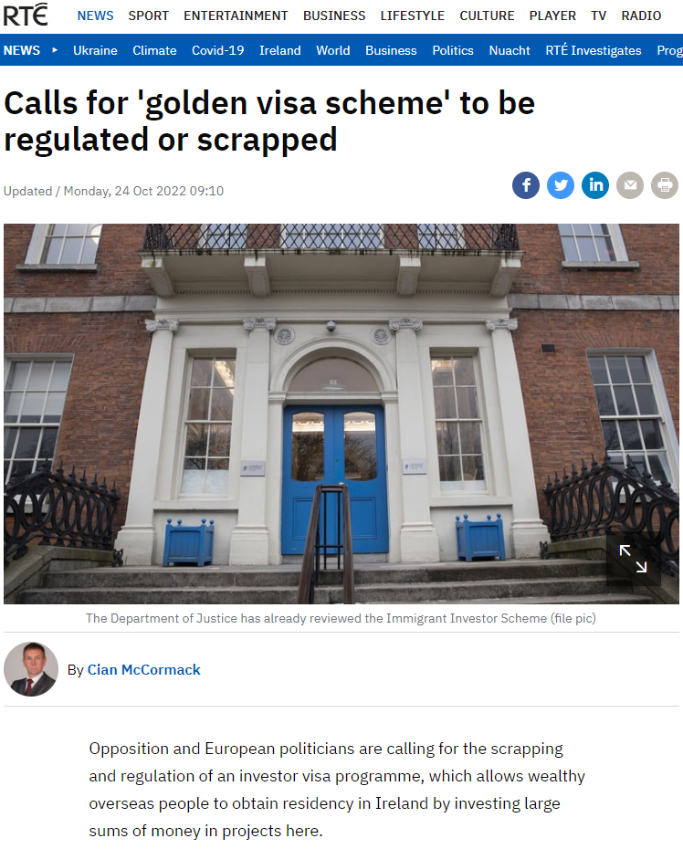 激增的移民申請(qǐng)數(shù)據(jù)迅速引起了業(yè)界關(guān)注。10月24日,據(jù)愛爾蘭國家廣播電臺(tái)RTÉ報(bào)道,愛爾蘭反對(duì)派和部分歐洲政界人士呼吁廢除或監(jiān)管“愛爾蘭投資移民計(jì)劃”。