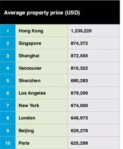 據報告顯示,全球房價最高的三個城市均位于亞洲。香港以套均123.5萬美元的成交均價蟬聯全球房價最高城市榜首,其次是新加坡的87.4萬美元,上海和溫哥華緊隨其后。排在前十名的美國城市有洛杉磯和紐約。深圳和北京分別排名第五和第九位。