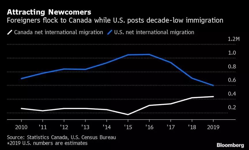 2019年,加拿大接收了43.7萬新移民,實現(xiàn)了30年來最快的人口增長。反觀美國,雖然人口基數(shù)龐大(為加拿大人口的10倍),國際移民卻連續(xù)第三年大幅下降,僅接收了59.5萬新移民,為近十年最低點。