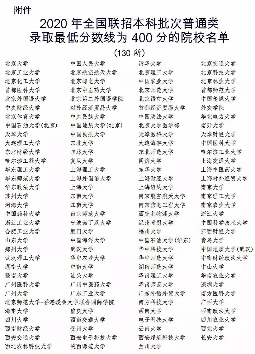 (一)普通類(lèi)院校(專(zhuān)業(yè))文史、理工類(lèi):300分(其中,部分院校執(zhí)行400分,院校名單見(jiàn)附件);