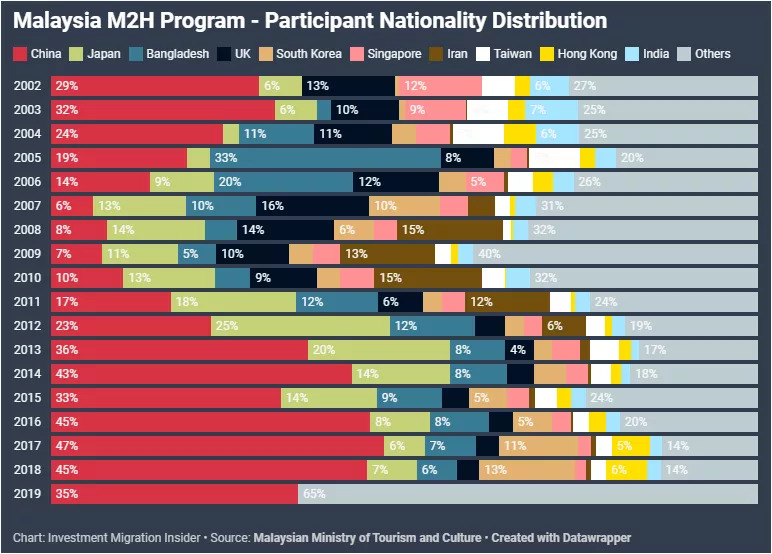 據馬來西亞旅游和文化部副秘書長透漏,去年中國大陸公民約占第二家園項目所有申請量的35%,此外,前10的申請人來源國/地區還包括韓國、香港、日本、孟加拉、英國、新加坡、美國、臺灣、印度,但沒有透漏各個國家/地區的具體數字。