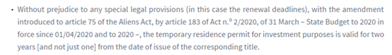 今年4月,葡萄牙頒布了第2/2020號法令,其中的第183條對移民法里居留卡的有效期進行了修改,將黃金居留卡的首次有效期由1年調整為2年。盡管法案已經生效,但卻缺乏法案的具體執行細節。