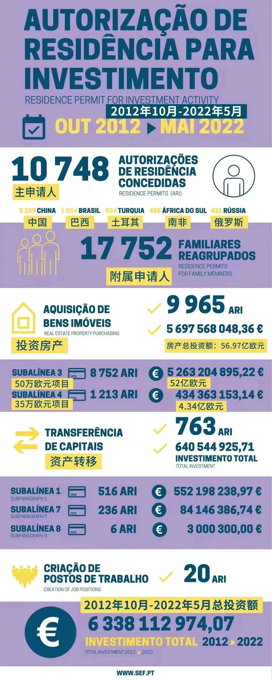 葡萄牙移民局也再次更新了2012年10月黃金居留政策推行以來的整體數據,數據顯示,10年來,已有10748位主申請人獲批葡萄牙黃金簽證,其中中國家庭為5109組,占比約50%,可見中國投資者對葡萄牙項目的喜愛和認可。通過黃金簽證計劃,葡萄牙共吸納了63.38億歐元投資,其中56.97億資金直接投資于房地產市場。