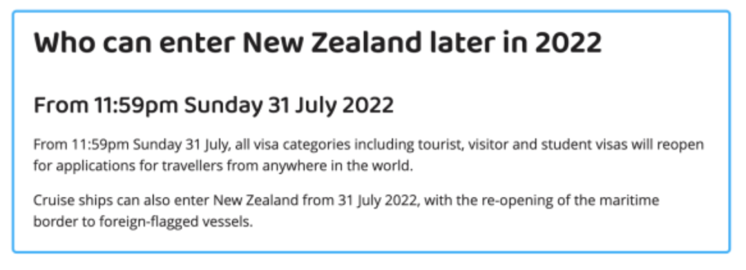 當地時間7月31日23時59分,因新冠疫情關閉了兩年多的新西蘭邊境對所有游客和國際學生全面開放,海上邊界也將重開。這一消息意味著:除新西蘭公民、居民以及澳洲公民之外,只要持有有效簽證的人都可以入境新西蘭。國際學生和游輪的回歸,將為教育和旅游業提供急需的經濟動力。注意,入境前需提供獲新西蘭政府認可的新冠疫苗完全接種證明。