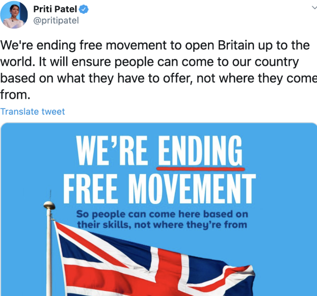 對(duì)此,英國(guó)內(nèi)政大臣帕特爾表示:“全新的移民法案將徹底終結(jié)歐盟人口自由流動(dòng)原則,并為我們推行新的積分制移民鋪平道路”。
