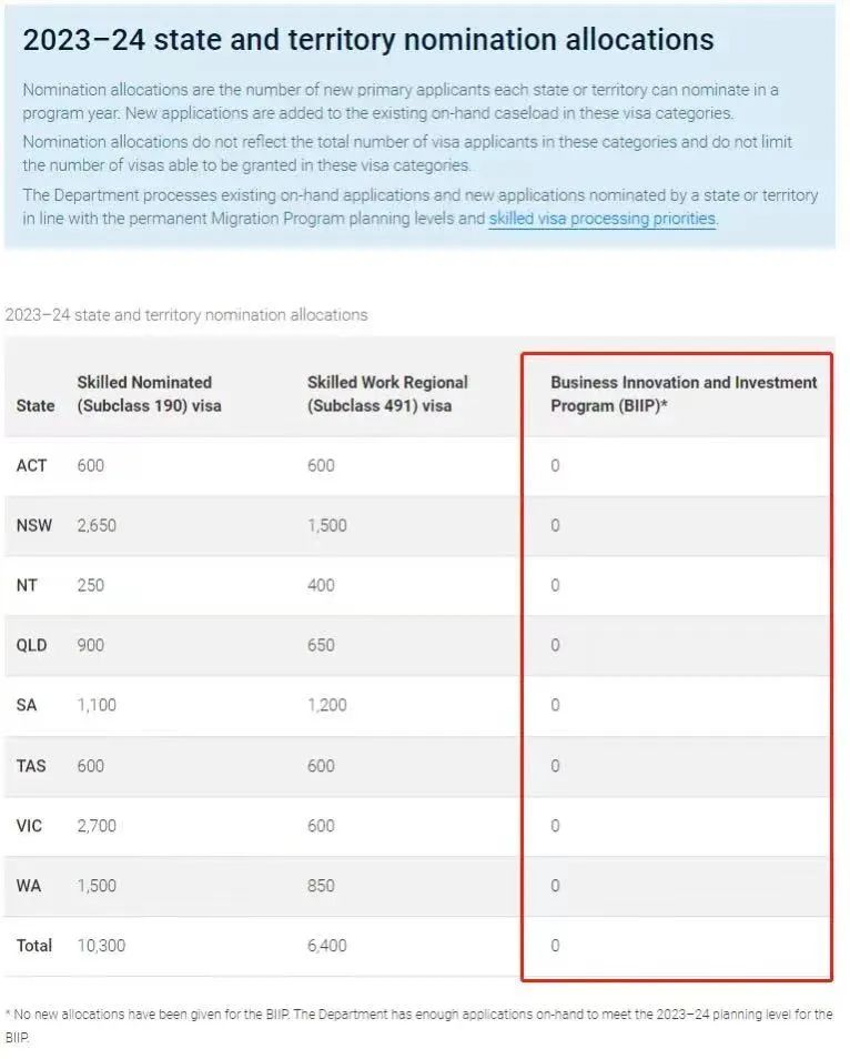 此外,各州投資移民配額全部為零!本財年澳洲投資移民通道全部關(guān)閉,無任何邀請配額。
