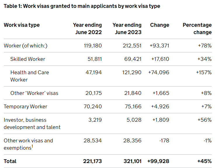 在截至2023年6月的一年里,英國共向主申請人發(fā)放了約32萬份工作簽證,比截至2022年6月的約22萬份大增45%,增長了近10萬份。
